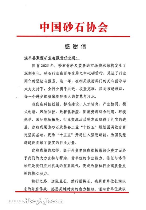 近日,河北創(chuàng)遠(yuǎn)投資集團(tuán)旗下灤平縣聚源礦業(yè)有限責(zé)任公司收到中國(guó)砂石協(xié)會(huì)發(fā)來(lái)的感謝信。信中對(duì)聚源礦業(yè)的專業(yè)能力、信任與協(xié)作表示高度認(rèn)可,感謝聚源礦業(yè)長(zhǎng)期以來(lái)的并肩作戰(zhàn)和關(guān)鍵時(shí)刻的鼎力相助。